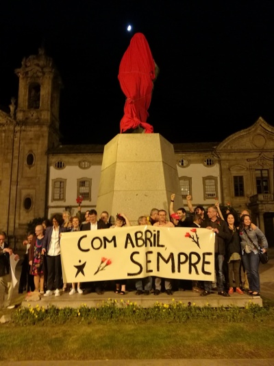 Ativistas do Bloco de Esquerda, na madrugada deste 25 de Abril, taparam a estátua do Manuel Gomes da Costa, situada na Praça Conde de Agrolongo, em Braga.